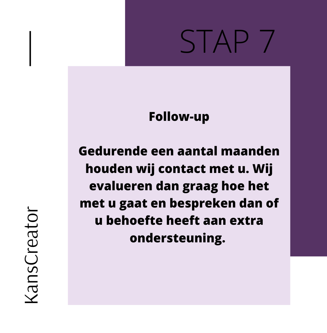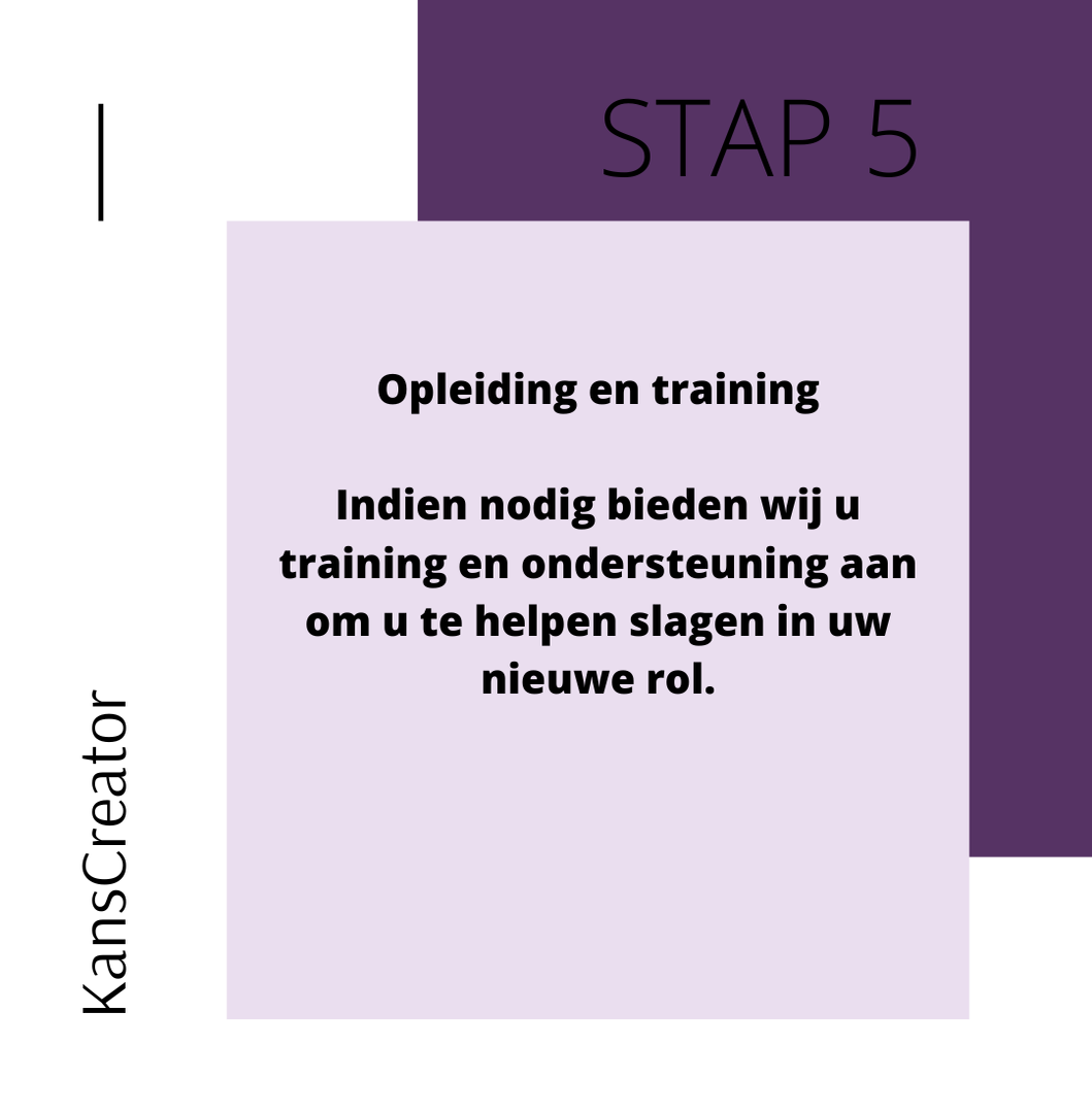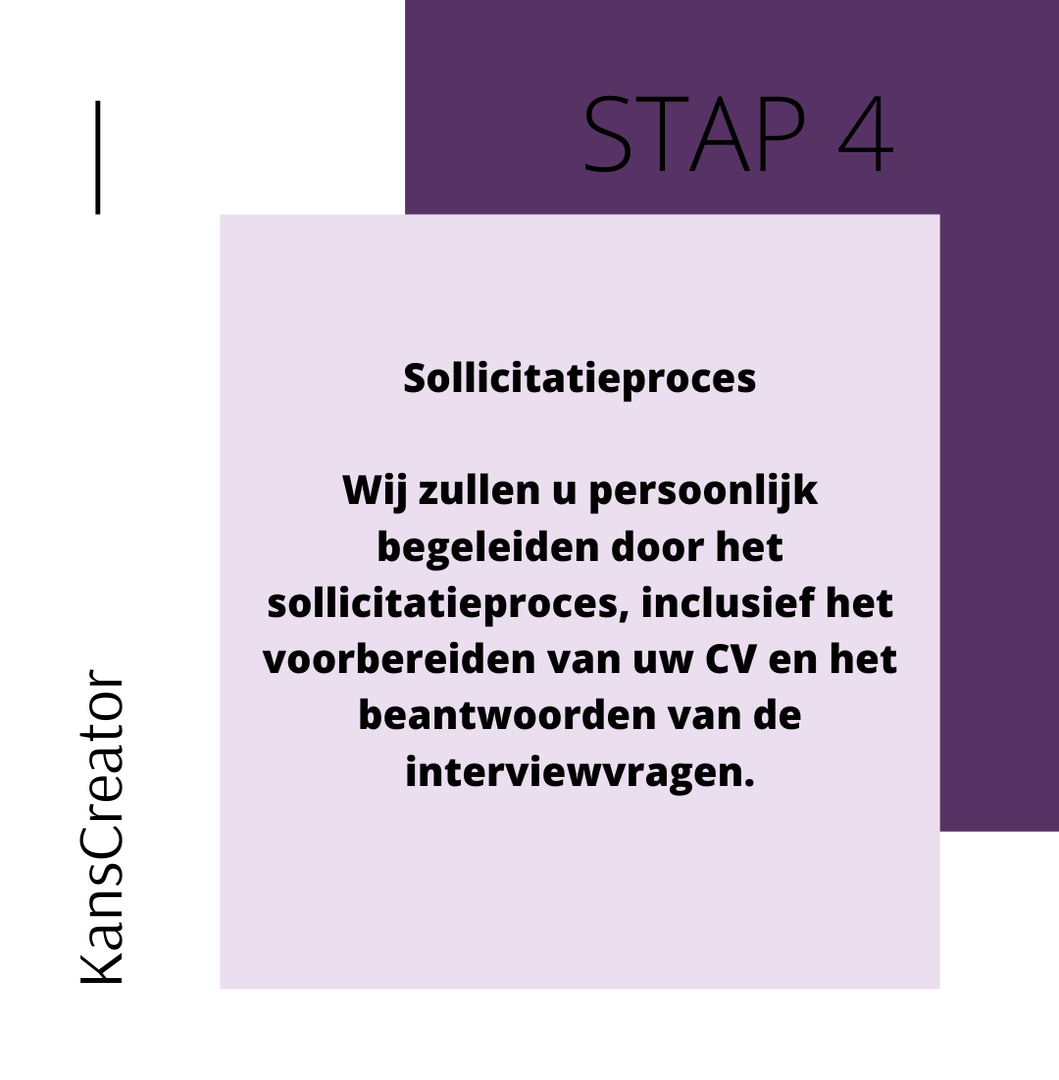 KansCreator biedt persoonlijke begeleiding bij het vinden van de juiste baan. Dit doen we door u eerst uit te nodigen voor een gesprek om u persoonlijk te leren kennen. Hierin bespreken we onder andere uw vaardigheden, ervaringen en kijken we samen naar baan interesses en mogelijkheden. Vervolgens gaan we voor u aan de slag op zoek naar de passende functie. Hierin staan de wensen en behoeften van u centraal.